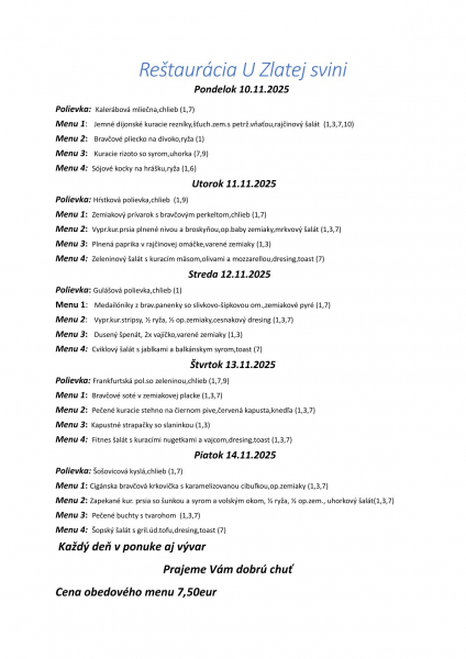Menu 1: Jemné dijonské kuracie rezníky,šťuch.zem.s petrž.vňaťou,rajčinový šalát (1,3,7,10)