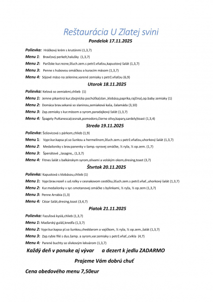 Menu 1: Vypr.kur.kapsa pl.so šunkou a hermelínom,šťuch.zem.s petrž.vňaťou,uhorkový šalát (1,3,7)